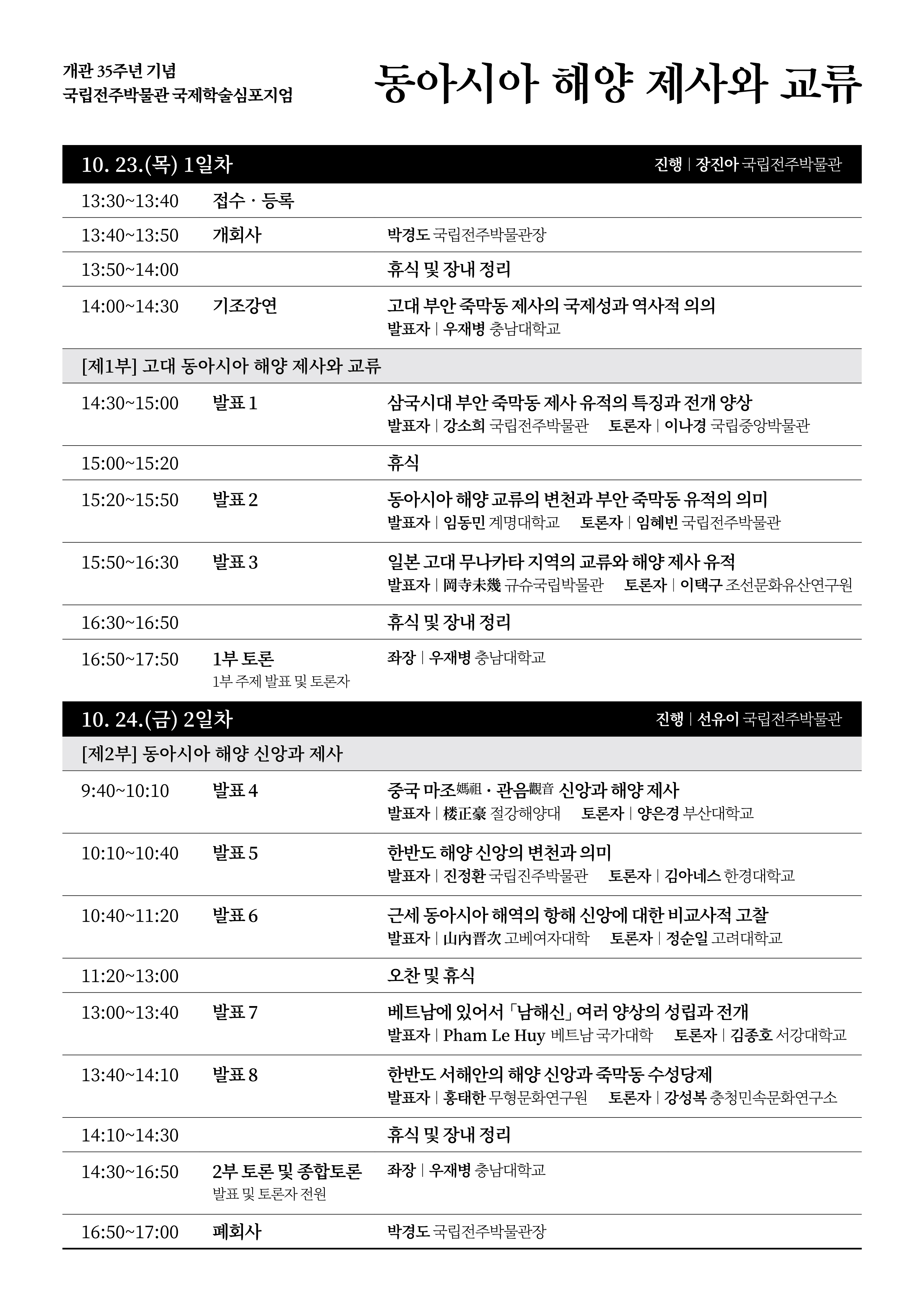 호남사학회 회원 여러분께 안녕하십니까? 호남사학회입니다. 다름이 아니라 국립전주박물관에서 개관 35주년을 맞아 국제학술심포지엄 ‘동아시아 해양 제사와 교류’를 개최한다는 소식을 전달 드립니다. 이번 심포지엄은 개관 5주년 기념 국제학술심포지엄 ‘부안 죽막동 제사 유적’ 이후 30년간 축적된 연구 성과를 종합하고, 동아시아 해양 신앙과 그 교류 양상을 조명하고자 마련되었습니다. 하단에 포스터와 일정표를 첨부 드리오니 회원 여러분의 많은 관심과 참여 부탁드립니다. 감사합니다. - 주 제: 동아시아의 해양 제사와 교류 - 일 시: 2025. 10. 23.(목) ~ 10. 24.(금) - 장 소: 국립전주박물관 강당