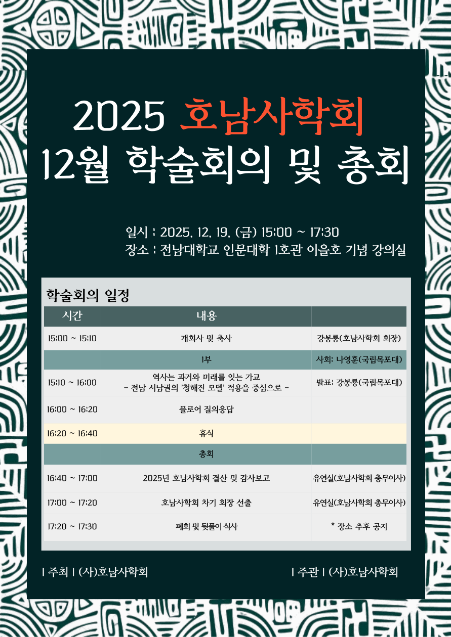 공지사항| 제 목 | 2025 호남사학회 12월 학술회의 및 총회 개최 소식 | ( 2025-12-24 13:31:18 , visit : 1 ) |
